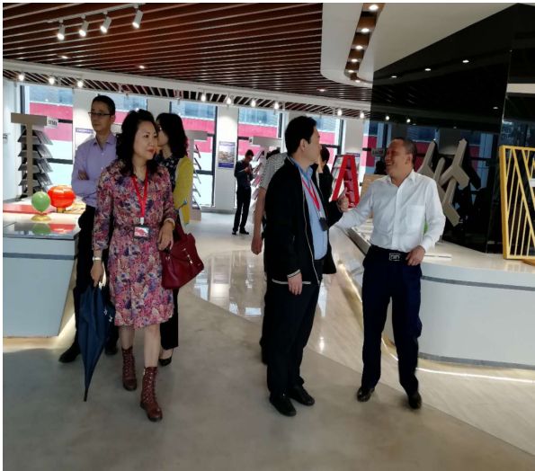領導們參觀了展廳的展品,對產品的原料來源、生產工藝、技術要求、用途、與傳統外墻磚相比較的優勢等都做了詳細的了解。